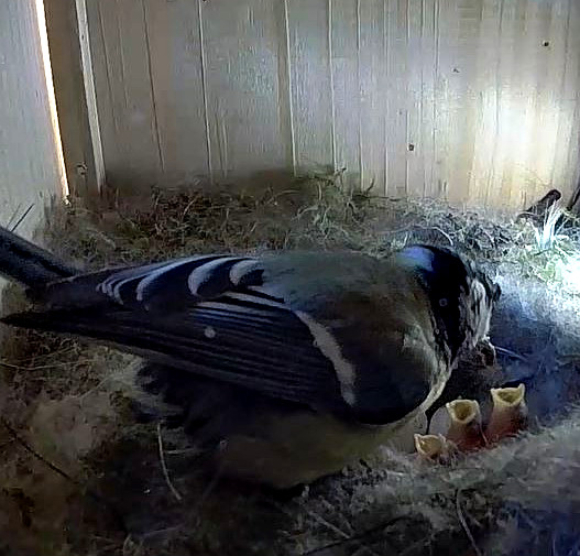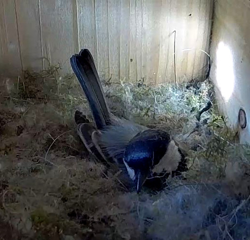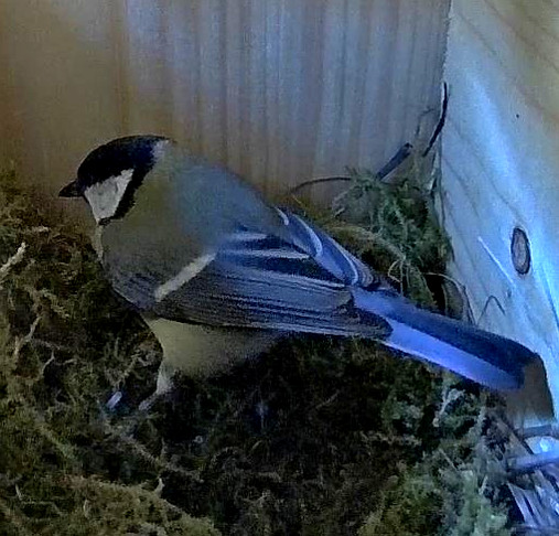 Nach den traurigen Ereignissen bei der ersten Brut scheint Mama Kohlmeise nun einen zweiten Brutversuch zu starten. Sie trägt wieder Nistmaterial in den Kasten und hübscht damit das Nest auf. Möglicherweise hat sie bereits wieder mit dem Eierlegen begonnen. Nachts nutzt sie den Nistkasten weiterhin als Schlafplatz. 😊