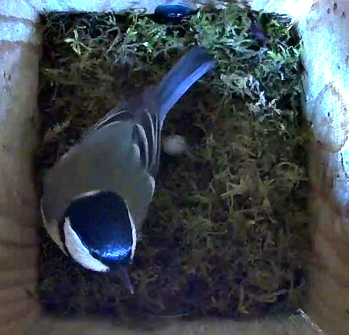 Im Video hat die Kohlmeisenmama schon mal für die Fütterung der Küken geübt. Gleich zu Beginn des Clips kommt sie mit einer winzigen Raupe oder einem kleinen Würmchen in den Nistkasten und fordert ihre noch in den Eiern befindlichen Küken mit einem kurzen Laut zum Schnabelsperren auf. Natürlich war die Aktion nicht von Erfolg gekrönt. 😉