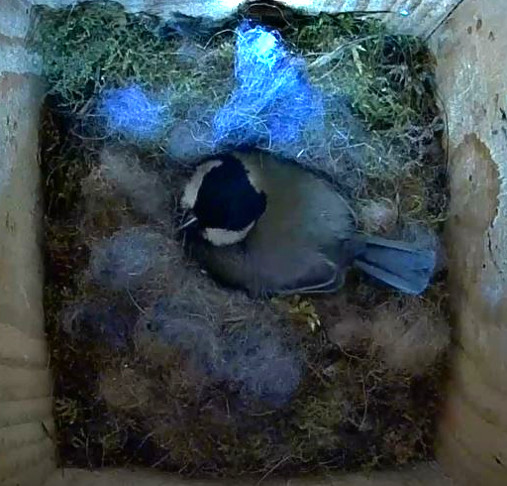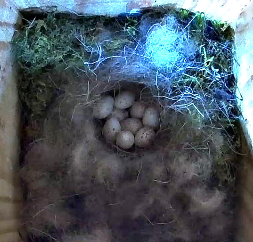 Es wird Zeit mal in den Nistkasten-1 zu schauen. Denn dort ist trotz ständiger Revierstreitigkeiten mit den Kohlis aus Nistkasten-2 ein zweites Kohlmeisenpärchen eingezogen. Mama Kohlmeise ließ sich viel Zeit mit dem Nestbau und dem Eier legen. Erst am 25. April hat sie auf 9 Eiern zu brüten begonnen.