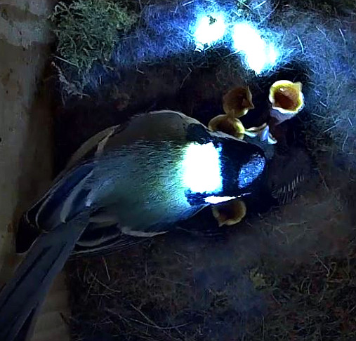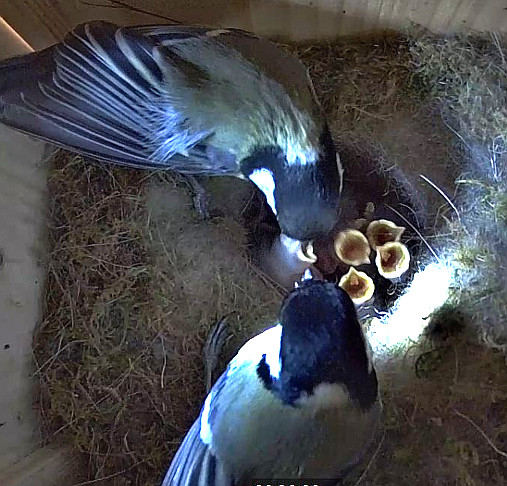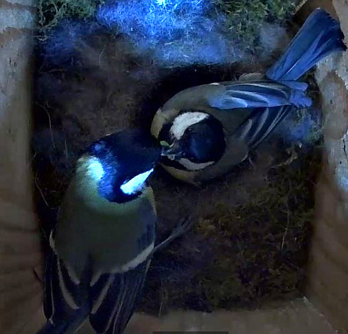 2023 brüteten in beiden Kamera-Nistkästen Kohlmeisen. Das war recht erstaunlich, weil Kohlmeisen in der Nähe ihrer eigenen Brut eigentlich keine andere Kohlmeisenbrut dulden. Allerdings kam es zwischen den beiden Kohlmeisenpärchen immer wieder zu Revierstreitigkeiten. Zum Glück waren trotz des zusätzlichen Stresses beide Bruten erfolgreich. Insgesamt flogen 15 junge Kohlmeisen aus.