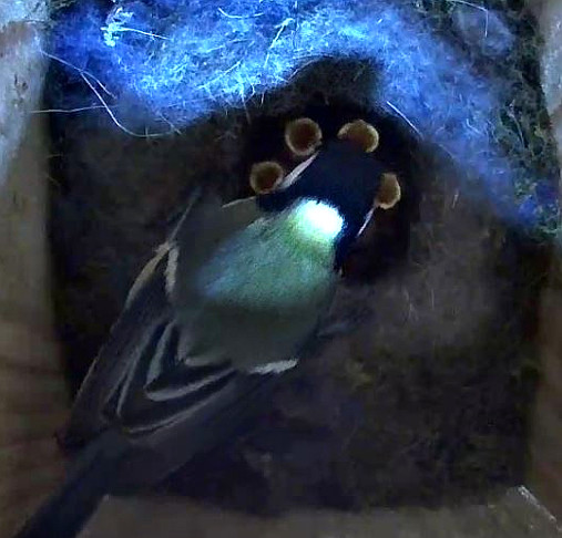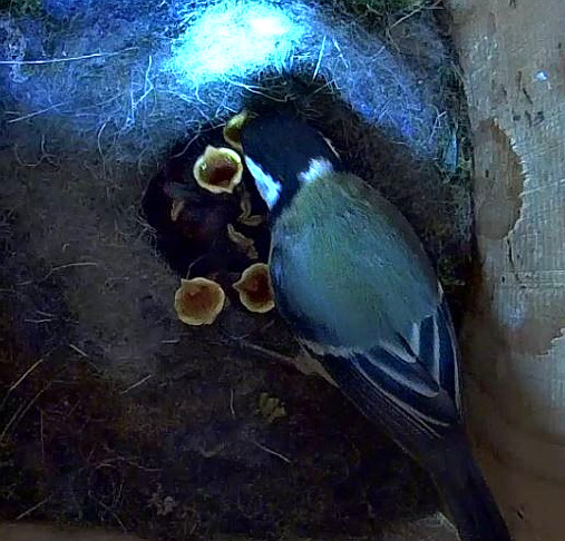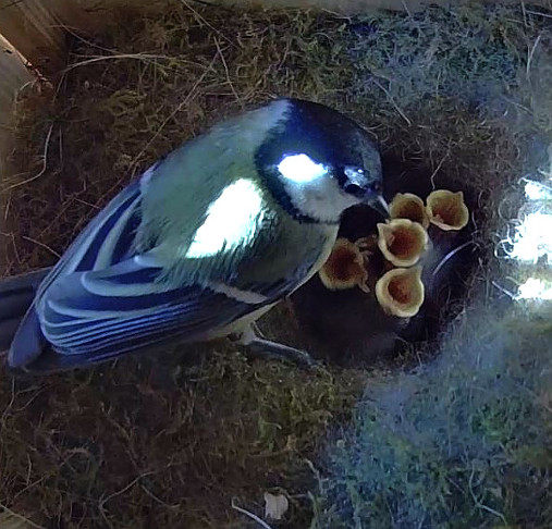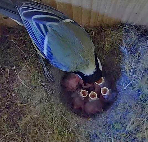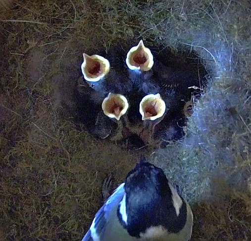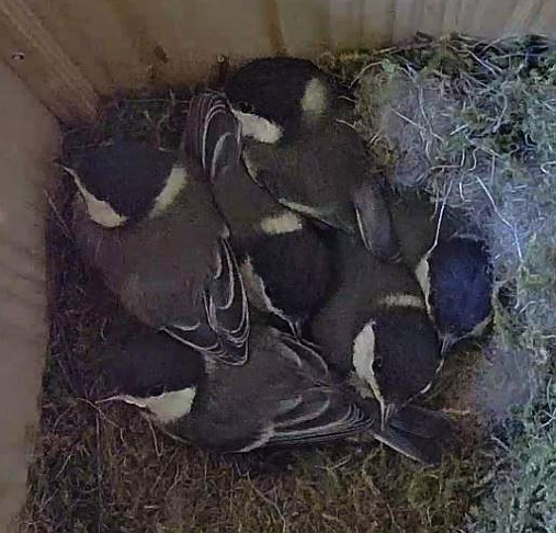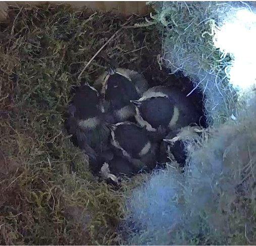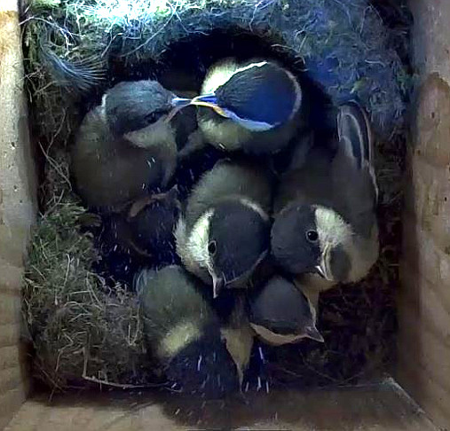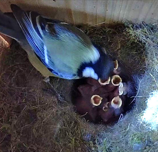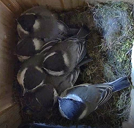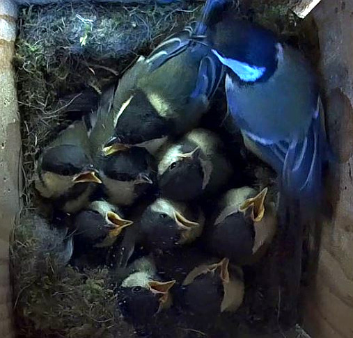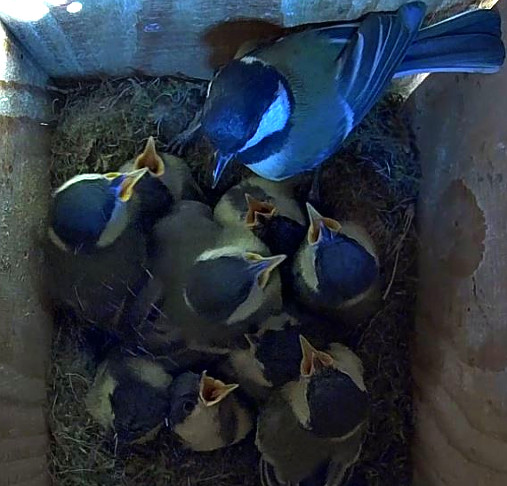 Nachdem die Nestlinge im Nistkasten-2 ausgeflogen sind, werden jetzt neun Kohlmeisenküken im Nistkasten-1 aufgezogen. Sie sind am 8. und 9. Mai geschlüpft. Bisher läuft alles optimal, beide Elternvögel füttern regelmäßig und die Küken entwickeln sich prima. 😊