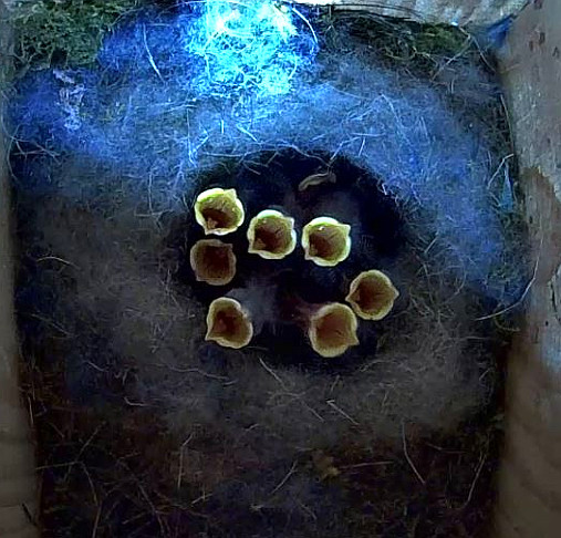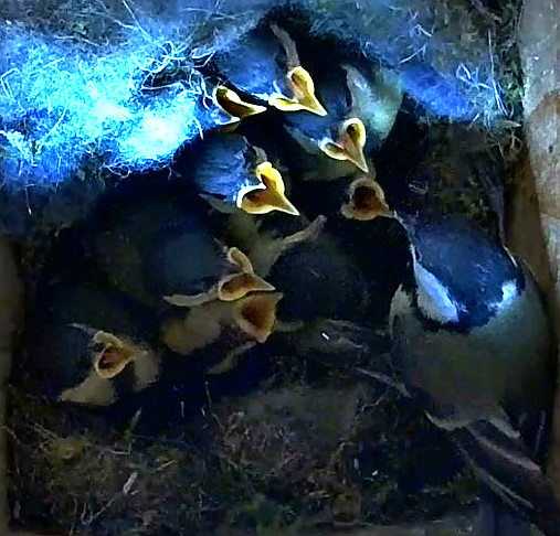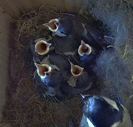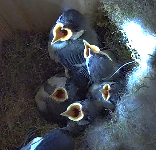 Die sechs jungen Kohlis entwickeln sich prima. Heute sind sie schon 17 Tage alt. Bereits Mitte nächster Woche werden sie den Nistkasten verlassen und dann eine ganz neue (Vogel)Welt kennenlernen.