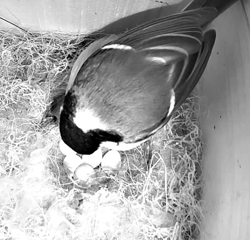 Nachdem Mama Kohlmeise 10 Eier gelegt hatte, begann sie am 7. April zu brüten. Seltsamerweise ist wenig später ein Ei verschwunden. Deshalb liegen jetzt nur noch 9 Eier im Nest. Die Brutdauer beträgt bei Kohlmeisen meistens so um die 14 Tage. Deshalb sollten schon in den kommenden Tagen die ersten Küken schlüpfen.