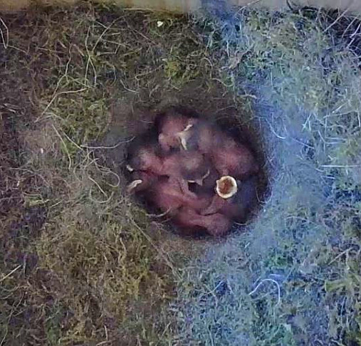 Die Küken sind da! Am 20. Und 21. April schlüpften innerhalb kurzer Zeit vermutlich alle Küken. Nicht ausgebrütete Eier sind jedenfalls keine mehr zu sehen. Die Vogelbabys machen einen gesunden Eindruck. Ob wirklich alle neun am Leben sind, ist allerdings schwer zu sagen. Denn noch ist es kaum möglich, die Küken mit Gewissheit zu zählen.
