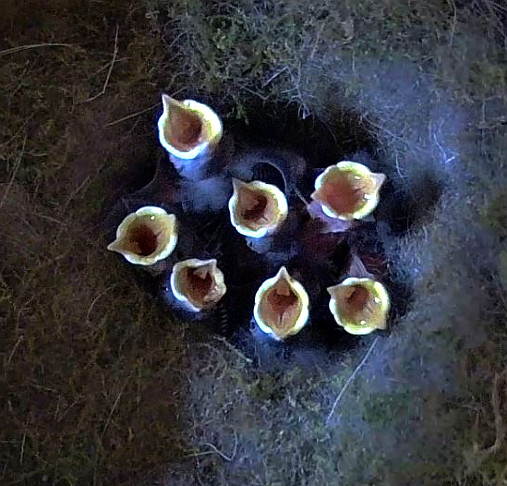 Inzwischen sind die vermutlich 8 Kohlmeisenküken 7 Tage alt. Sie entwickeln sich prima. Schon bald werden sie ihre Äuglein öffnen.