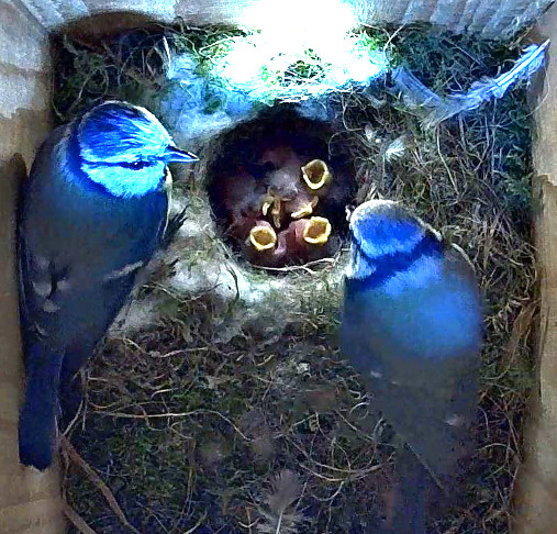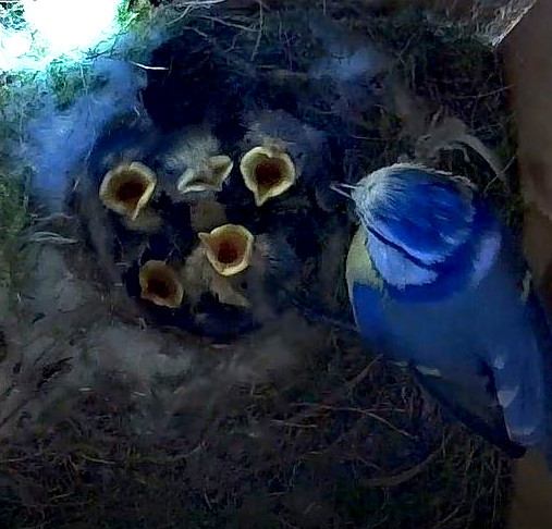Nur wenige Tage, nachdem im Nistkasten-2 unsere fünf jungen Kohlmeisen ausgeflogen sind, schlüpften im Nistkasten-1 sieben Blaumeisenküken. Inzwischen sind sie schon 4 Tage alt. Auch diese Brut verläuft zum Glück bisher ohne Probleme. Ich hoffe, das bleibt auch so! 😊🍀