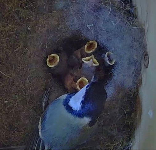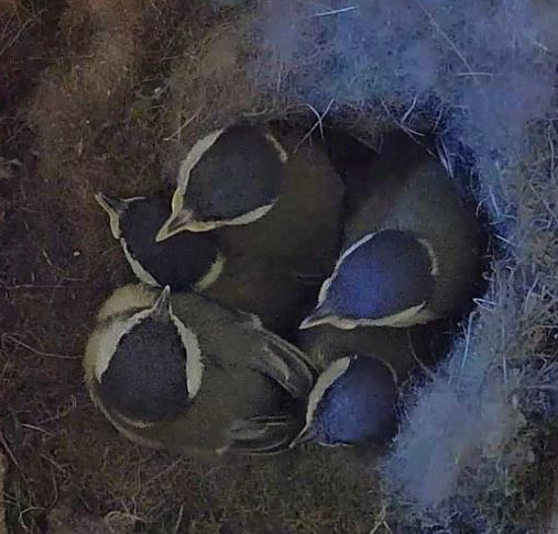 2024 war Nistkasten-1 von Blaumeisen und Nistkasten-2 von Kohlmeisen belegt. Mit 7 Eiern bei den Blauis und 5 Eiern bei den Kohlis waren beide Gelege relativ klein. Alle 12 Eier wurden ausgebrütet. Leider starben wenige Tage nach dem Schlüpfen die zwei schwächsten Blaumeisenküken. Alle übrigen 10 Blau- und Kohlmeisenkinder entwickelten sich prima. Nach knapp 20 Tagen verließen die Nestlinge gesund und munter ihre Geburtsstätte.